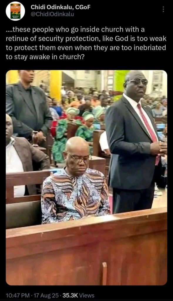 ”…these people who go inside church with a retinue of security protection, like God is too weak to protect them even when they are too inebriated to stay awake in church?”.. He queried.