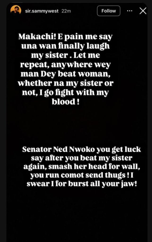Let me repeat, anywhere wey man Dey beat woman, whether na my sister or not, I go fight with my blood!“Senator Ned Nwoko you get luck say after you beat my sister again, smash her head for wall, you run comot send thugs! I swear I for burst all your jaw!”